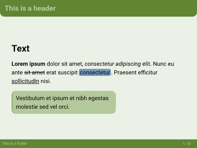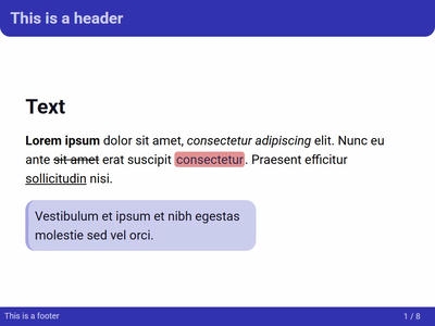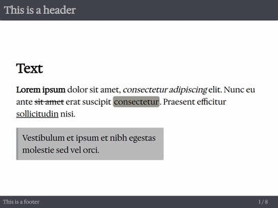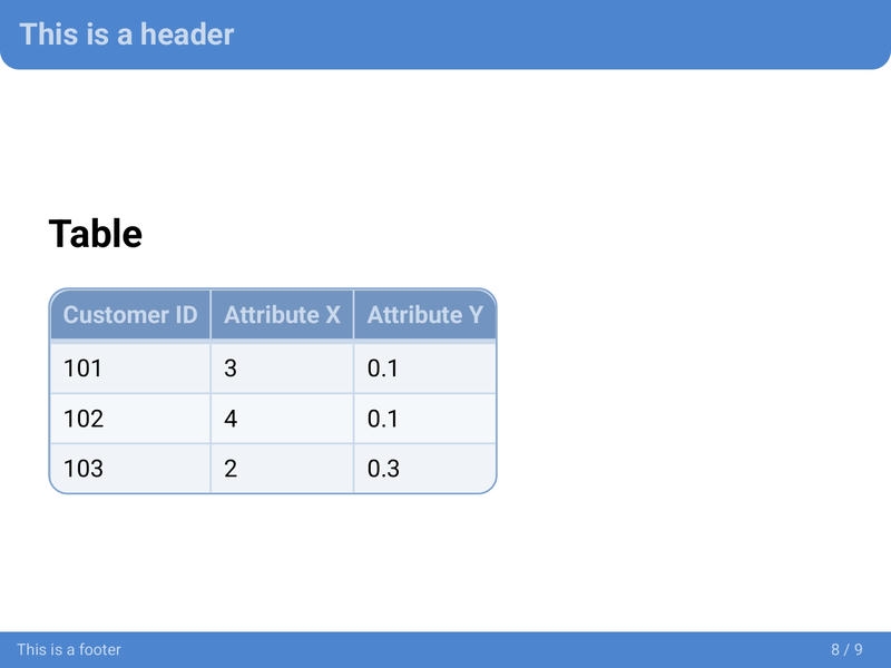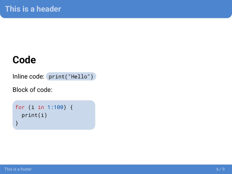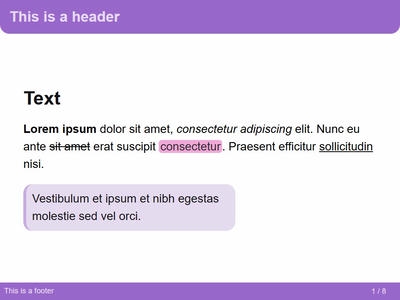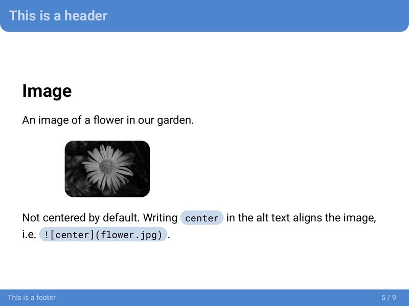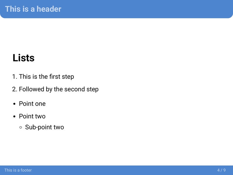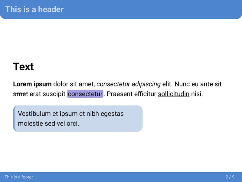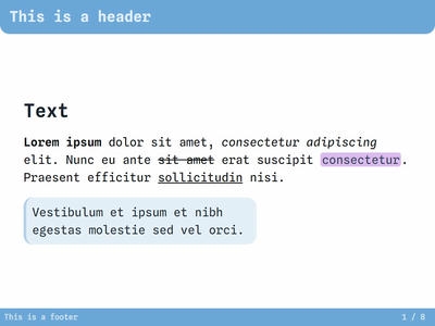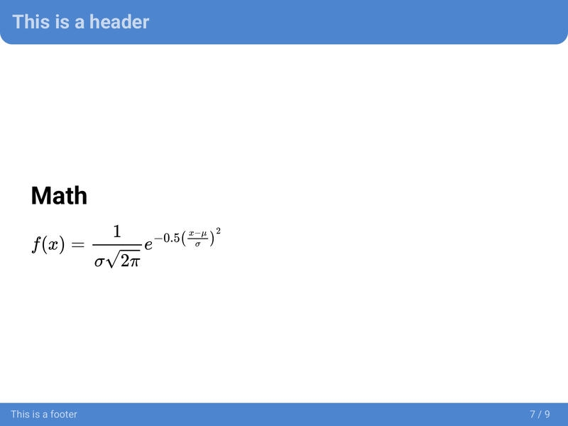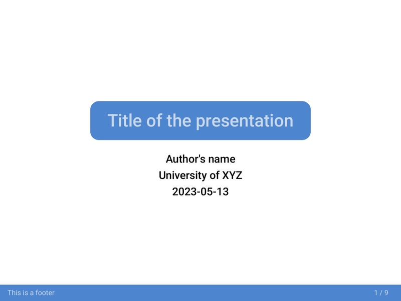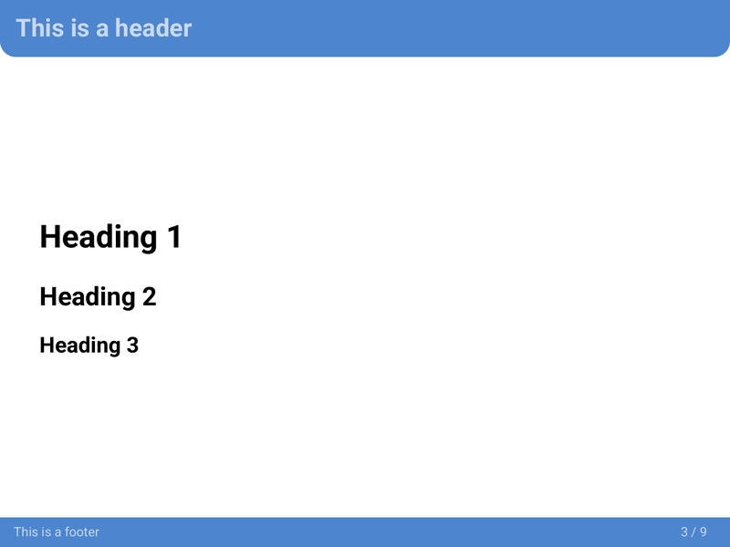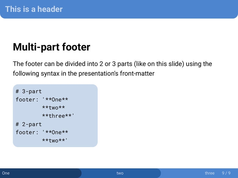 The footer can be divided into 2 or 3 parts using the following syntax in the presentation’s front-matter