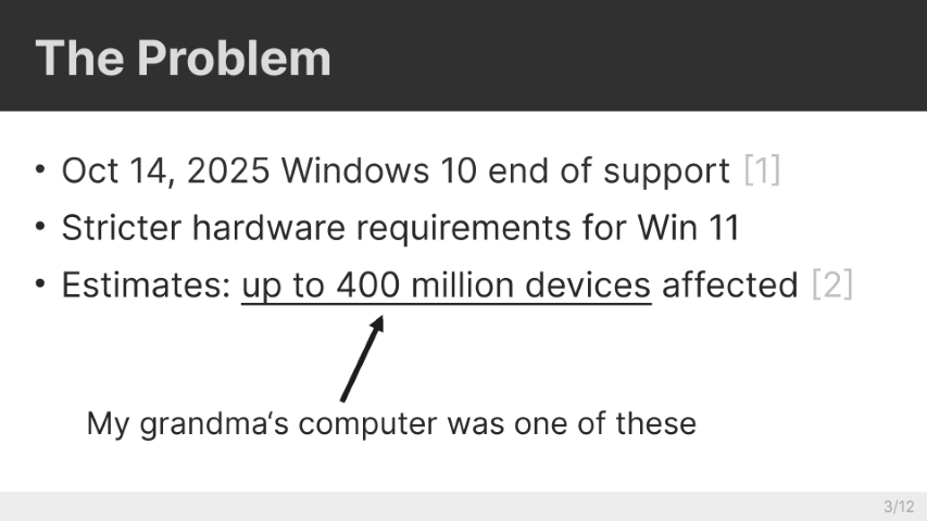 In my talk titled “My Grandma Needed a New Computer?”, I told a personal story about a project I undertook with my grandma and her PC. The main issue was that her computer was running Windows 10, which was due to reach the end of support. Additionally, because of old hardware, there was no long-term sustainable way to upgrade her system to the next version. You can probably guess where this is going, but in this post, I would like to go over some of my slides and what I said during the talk with the goal of providing more information and nuance about the seemingly silly story.