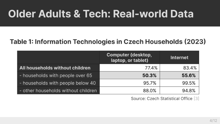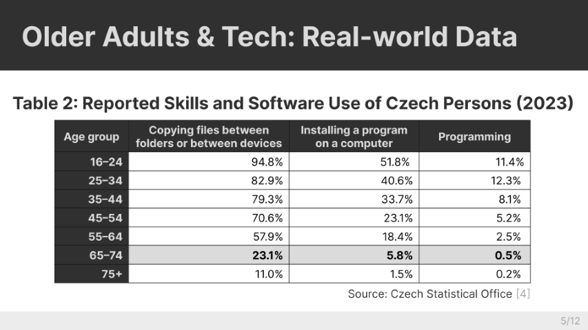 To give you some context about my grandma and her relationship with tech, let me actually start from the opposite direction, and let’s look at some population statistics. So this is a small section from a 2023 survey about Czech households and their relationship with tech, and for us, the important part is that households with people over 65 and no children – only about a half of those even owned a computer, right. If we go further and look at reported skills, then in my grandma’s age bracket, only about 23% of people knew how to copy files, and about 6% knew how to install a program.