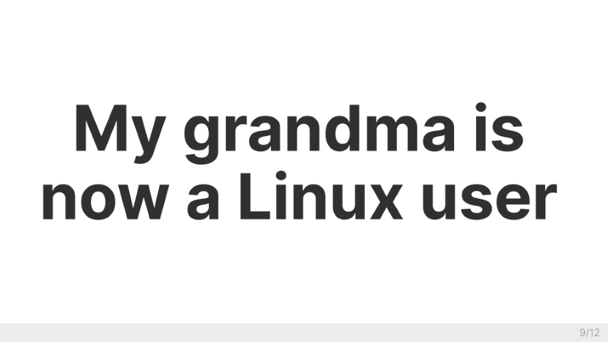 So to wrap this up, it turns out that my grandma did not meet a new computer, and if you’re wondering whether some of your less technical family members would be able to use Linux, just know that my grandma is doing fine. Thank you.